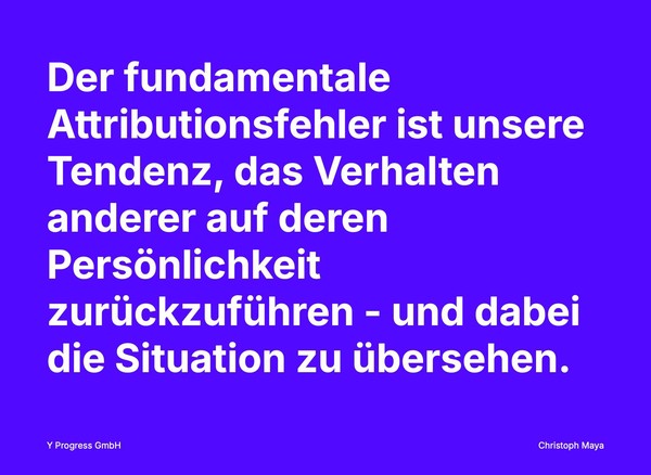 Der fundamentale Attributionsfehler ist unsere Tendenz, das Verhalten anderer Menschen auf deren Persönlichkeitseigenschaften zurückzuführen – und dabei die Situation zu übersehen. Wir gehen also davon aus, dass jemandes Verhalten Ausdruck seiner inneren Eigenschaften ist, anstatt äußere Umstände zu berücksichtigen.