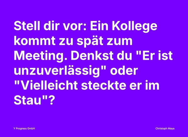 - Ohne Attributionsfehler: “Vielleicht steckte er im Stau oder hatte einen Notfall”