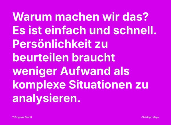Es ist einfach und schnell. Persönlichkeit zu beurteilen braucht weniger Aufwand als komplexe Situationen zu analysieren. Unser Gehirn sucht nach einfachen Erklärungen, um kognitive Ressourcen zu sparen.
