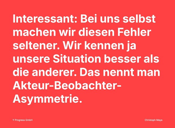 Interessant ist, dass wir bei uns selbst diesen Fehler seltener machen. Wir kennen ja unsere eigene Situation besser als die anderer Menschen. Das nennt man Akteur-Beobachter-Asymmetrie.